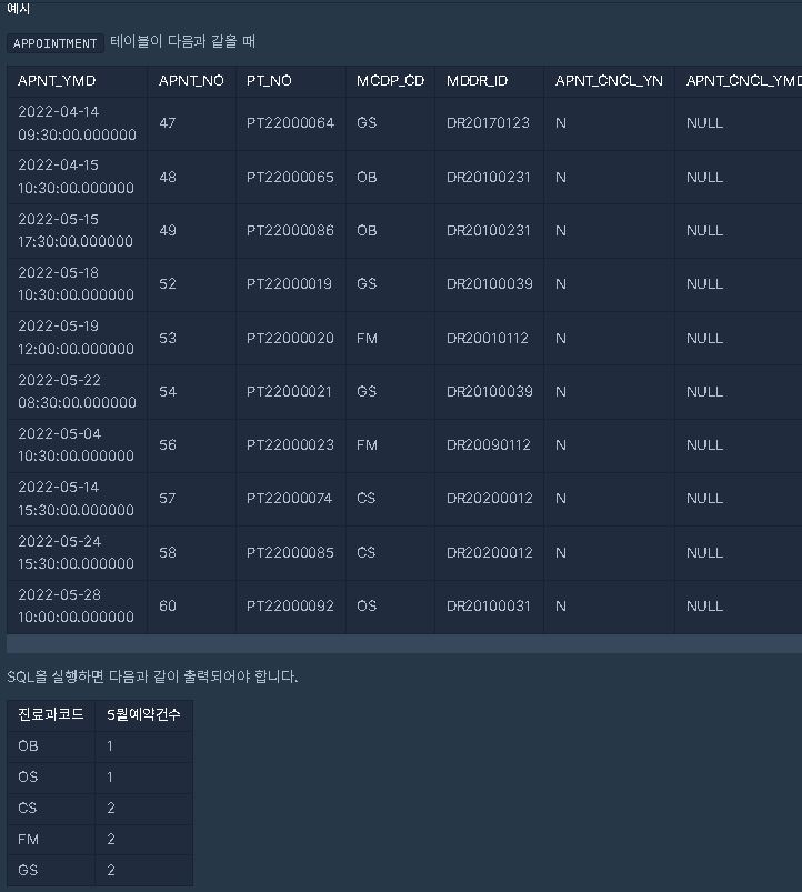 ==> GROUP BY MCDP_CD , TO_CHAR(APNT_YMD , 'MM') ==> 진료과 코드, 월별 예약건수에 대해 GROUP 화