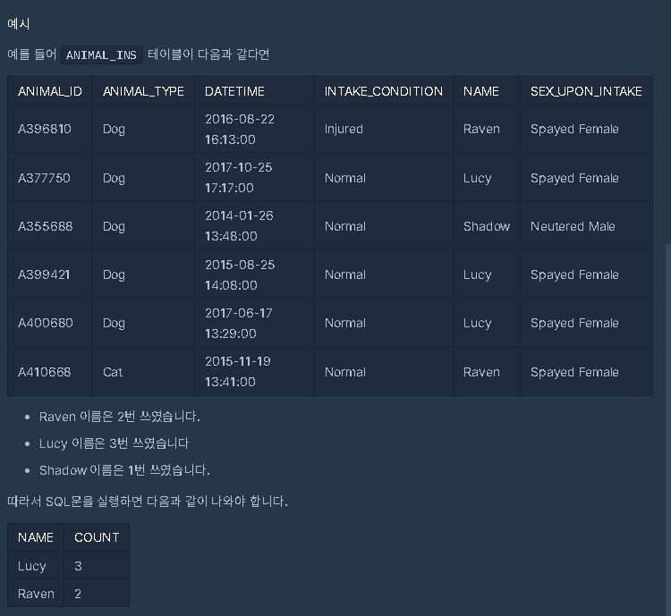 ==> FROM 절의 서브쿼리문을 통해 ANIMAL_INS 테이블의 NAME이 NULL값이 아닌 NAME들의 테이블만 갖고 온다.