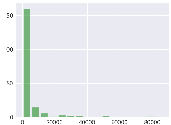 plt.hist(dansu_boksu_hab.iloc[:,-1] , bins , rwidth = 0.8 , color = 'green' , alpha = 0.5)