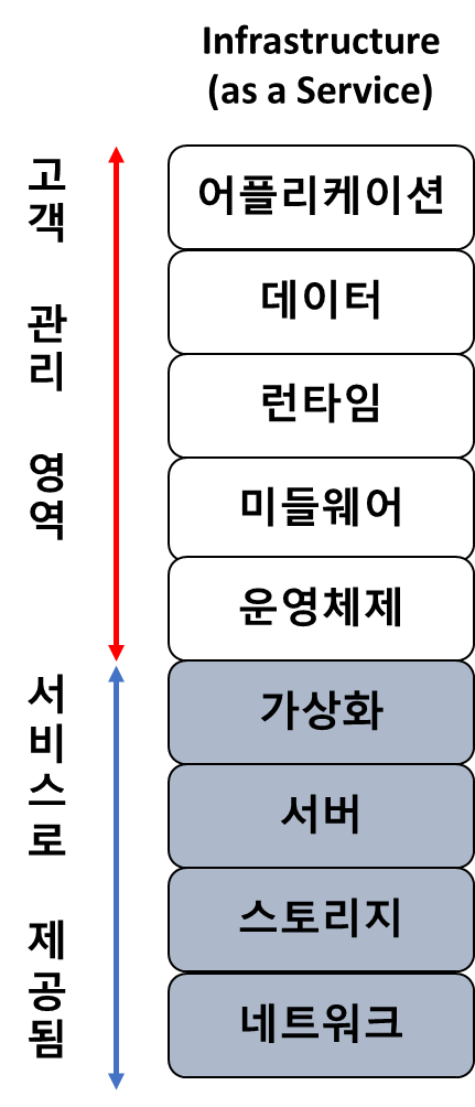 5. IaaS 제공업체는 서버, HDD, 네트워킹, 가상화 및 스토리지를 관리하며 고객은 OS, 미들웨어 , 어플리케이션 및 데이터와 같은 자원들을 관리해야 한다.