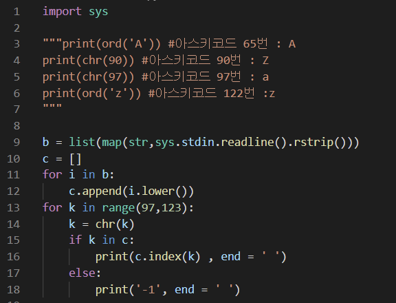 ★16번째줄 : c객체의 문자열의 index(k)를 받아와 출력시킨다. ==> k는 알파벳이다. 중복되는 값이 있다 하더라도
