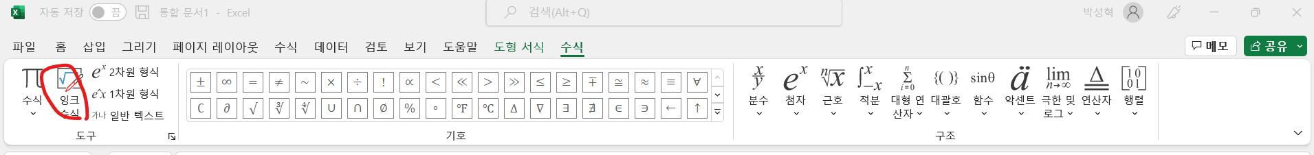 5. 액셀 실행 ==> 삽입 ==> 수식 ==> 잉크 수식 하면 수학식 입력판이 나온다.