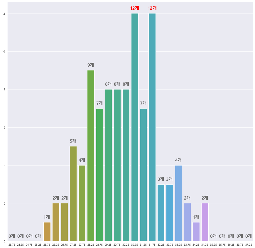 ax.text(i, b+0.2, str(txt)+'개' , ha='center' , color = 'red' , fontweight = 'bold' , fontsize=15)