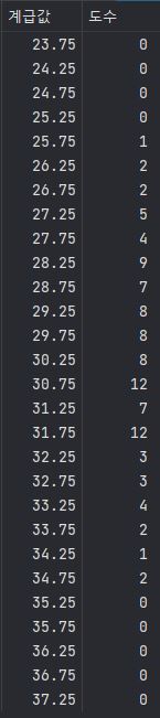 DOSU = pd.DataFrame({'계급값' : Steps , '도수' : hist})