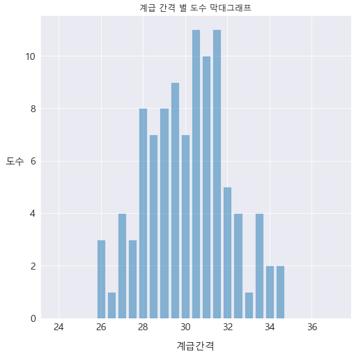 plt.xlabel('계급간격' , fontsize = 14 , labelpad= 14 ,rotation = 0)
