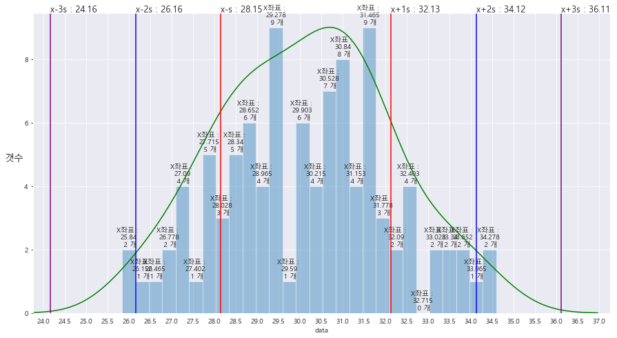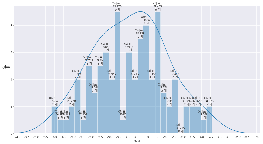 2-4 . 도수분포표를 히스토그램 & 정규분포 표현 (by Seaborn, distplot 사용!!)