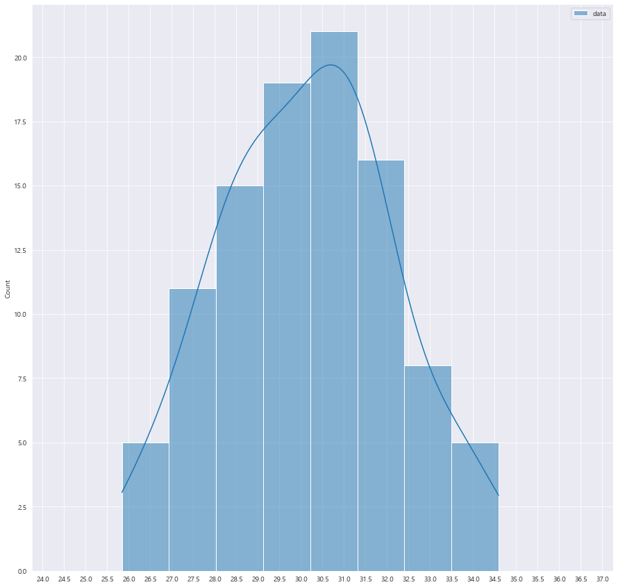bins : [23.5 24. 24.5 25. 25.5 26. 26.5 27. 27.5 28. 28.5 29. 29.5 30.