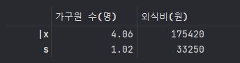 A = pd.DataFrame({'가구원 수(명)' : [4.06 , 1.02] , '외식비(원)' : [175420 , 33250]})