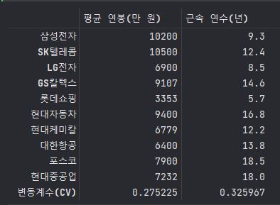 b = pd.DataFrame(['변동계수(CV)' , SALARY_CV , YEAR_CV])
