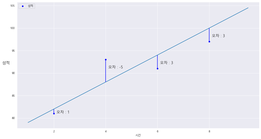ax.text(time[i]+0.1 , max(score[i],graph(time[i])) - abs((score[i]- graph(time[i]))//2) , f'오차 : {round(a[i])}',fontsize=13)