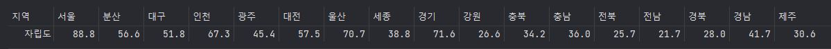 A = pd.DataFrame({'지역' : city , '자립도' : Zarib })