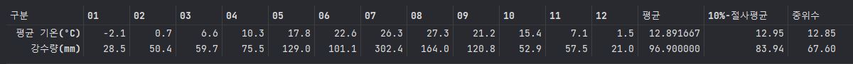 A = pd.DataFrame({"구분" : month , "평균 기온(ºC)" : average_temp , "강수량(mm)" : raine})