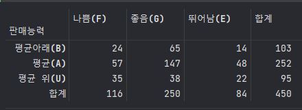 A = pd.DataFrame([avg_down , avg , avg_up] , index = ['평균아래(B)' , '평균(A)' , '평균 위(U)'] , columns= ['나쁨(F)' , '좋음(G)' , '뛰어남(E)'])