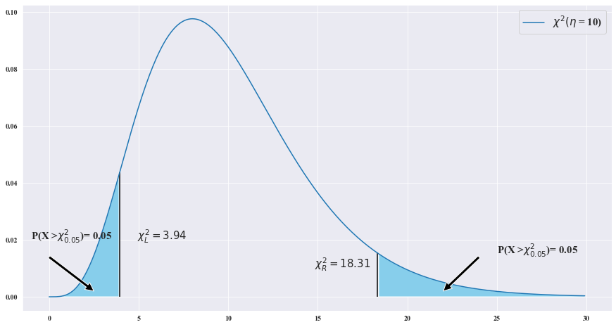 EX-01) 자유도 10인 카이제곱분포에서 왼쪽 꼬리확률과 오른쪽 꼬리확률이 각가 5%인 두 임계점을 구하라.