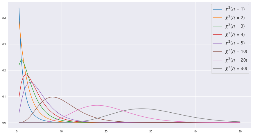 ==> n이 커질수록 카이제곱 분포는 정규분포에 근사한다.