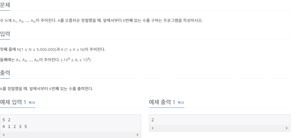 수 N개 A1, A2, ..., AN이 주어진다. A를 오름차순 정렬했을 때, 앞에서부터 K번째 있는 수를 구하는 프로그램을 작성하시오.