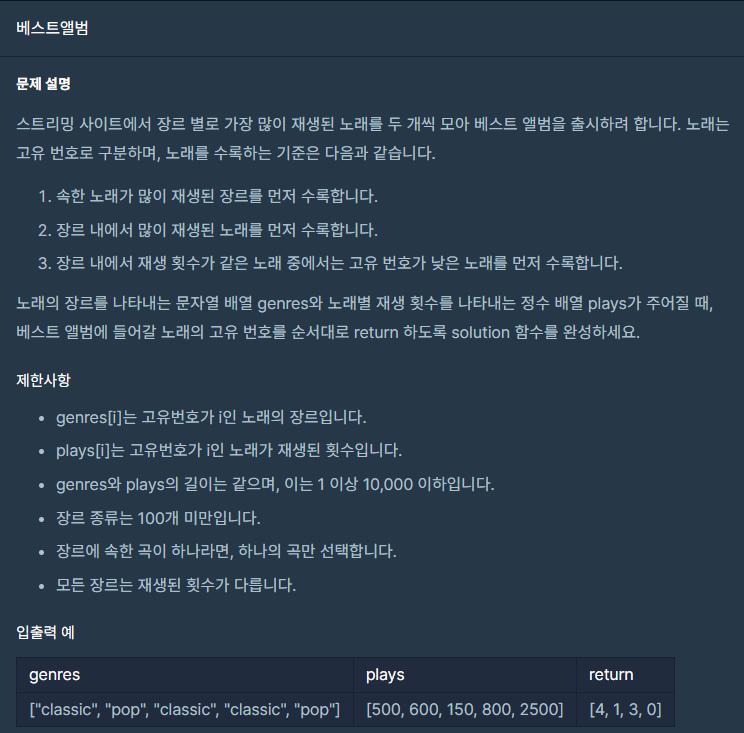 for (i, p) in sorted(dic1[k], key=lambda x:x[1], reverse=True)[:2]: #장르 별로 가장 많이 재생된 노래를 최대 두개까지 모아 베스트엘범 출시 하므로
