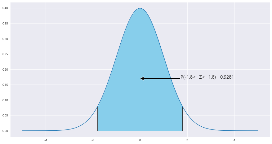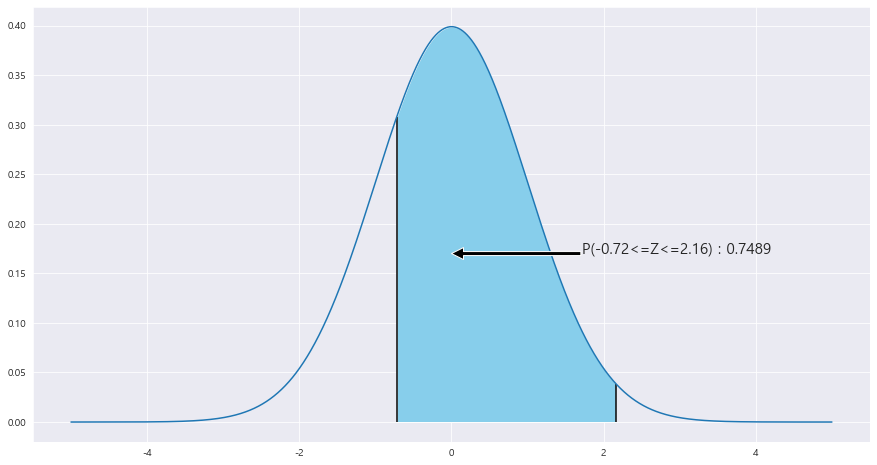 ax.fill_between(x, stats.norm.pdf(x, loc=0 , scale =1) , 0 , where = (x<=z_2) & (x>=z_1) , facecolor = 'skyblue') # x값 , y값 , 0 , x<=0 인곳 , 색깔