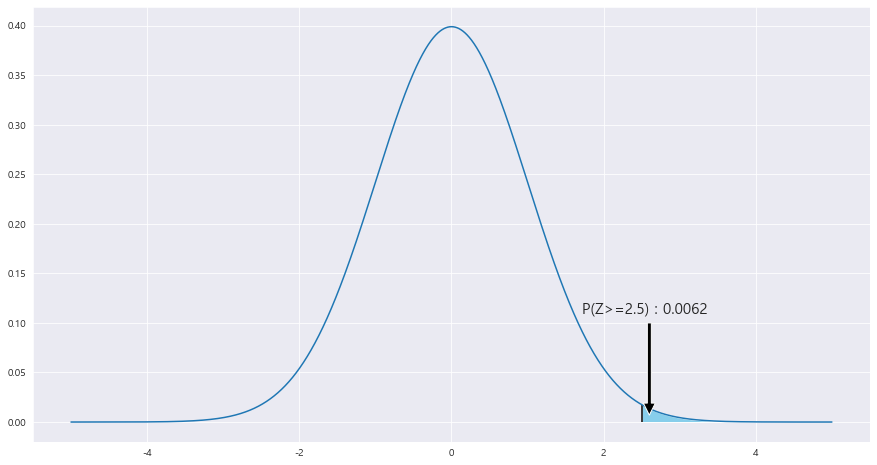 ax.fill_between(x, stats.norm.pdf(x, loc=0 , scale =1) , 0 , where = (x>=2.5) , facecolor = 'skyblue') # x값 , y값 , 0 , x<=0 인곳 , 색깔