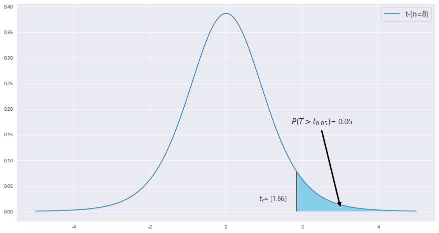자유도 8인 t-분포표에서 상위 5%인 95% 백분위수가 t_0.05 = 1.86