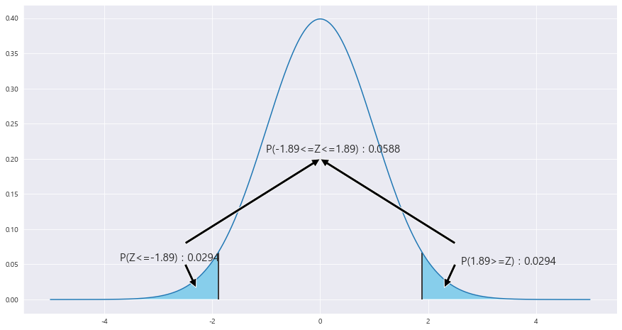 ax.fill_between(x, stats.norm.pdf(x, loc=0 , scale =1) , 0 , where = (x>=z_1) | (x<=-z_1) , facecolor = 'skyblue') # x값 , y값 , 0 , x<=0 인곳 , 색깔