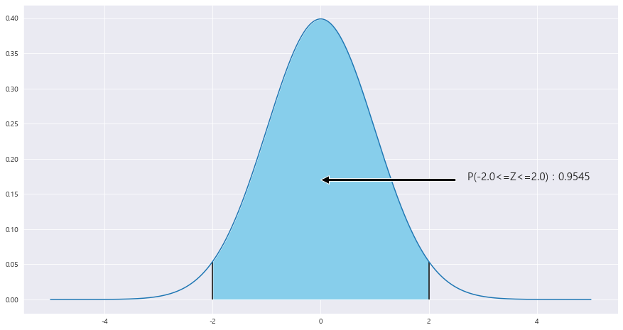ax.fill_between(x, stats.norm.pdf(x, loc=0 , scale =1) , 0 , where = (x>=z_2) & (x<= z_1) , facecolor = 'skyblue') # x값 , y값 , 0 , x<=0 인곳 , 색깔