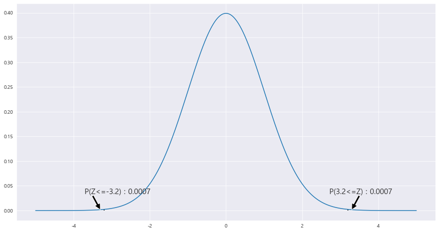 ax.text(-3.71 , .034, f'P(Z<={z_1}) : {round(area_2,4)}',fontsize=15)
