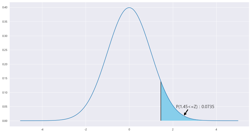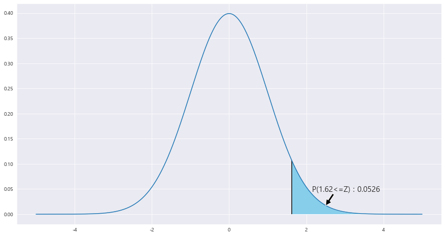 ax.text(2.15 , .045, f'P({z_1}<=Z) : {round(area,4)}',fontsize=15)