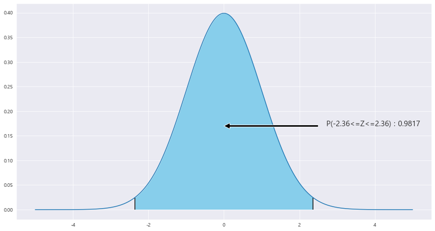 ax.fill_between(x, stats.norm.pdf(x, loc=0 , scale =1) , 0 , where = (x<=z_1) & (x>=-z_1) , facecolor = 'skyblue') # x값 , y값 , 0 , x<=0 인곳 , 색깔