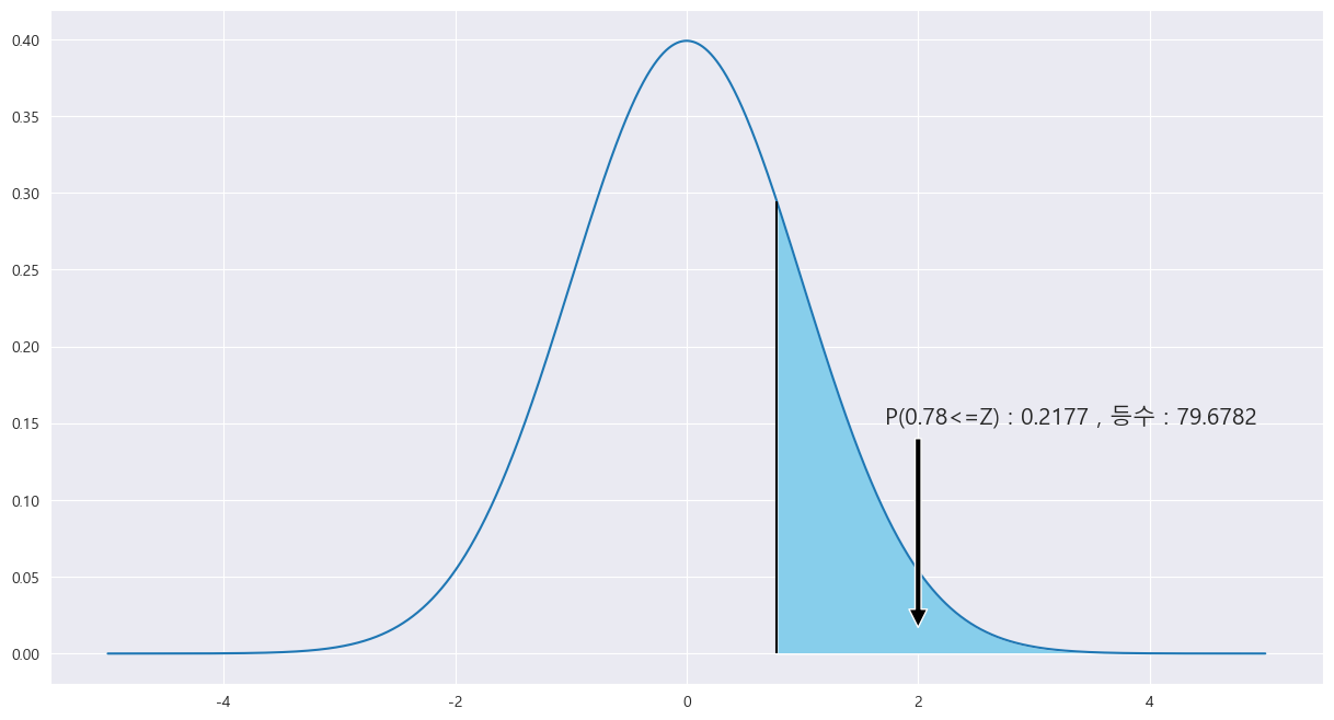ax.text(1.71 , .15, f'P({z_1}<=Z) : {round(area,4)} , 등수 : {366* round(area,4)} ',fontsize=15)
