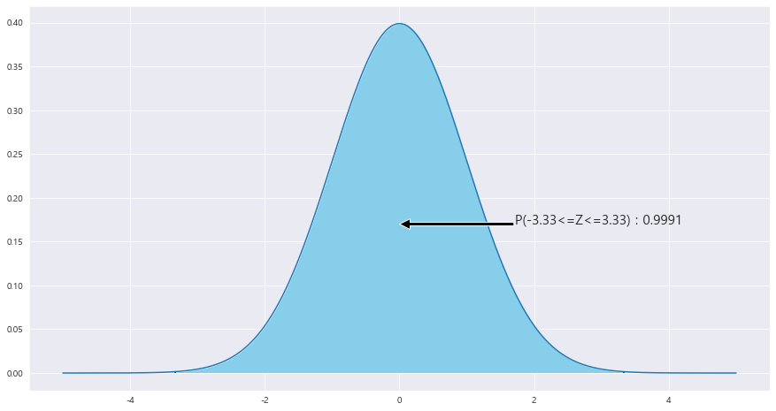 ax.fill_between(x, stats.norm.pdf(x, loc=0 , scale =1) , 0 , where = (x<=z_1) & (x>= -z_1) , facecolor = 'skyblue') # x값 , y값 , 0 , x<=0 인곳 , 색깔