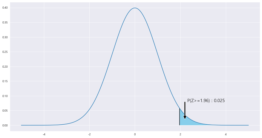 ax.fill_between(x, stats.norm.pdf(x, loc=0 , scale =1) , 0 , where = (x>=z_1) , facecolor = 'skyblue') # x값 , y값 , 0 , x<=0 인곳 , 색깔