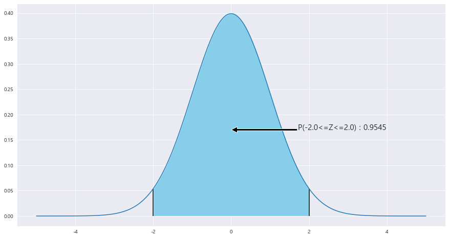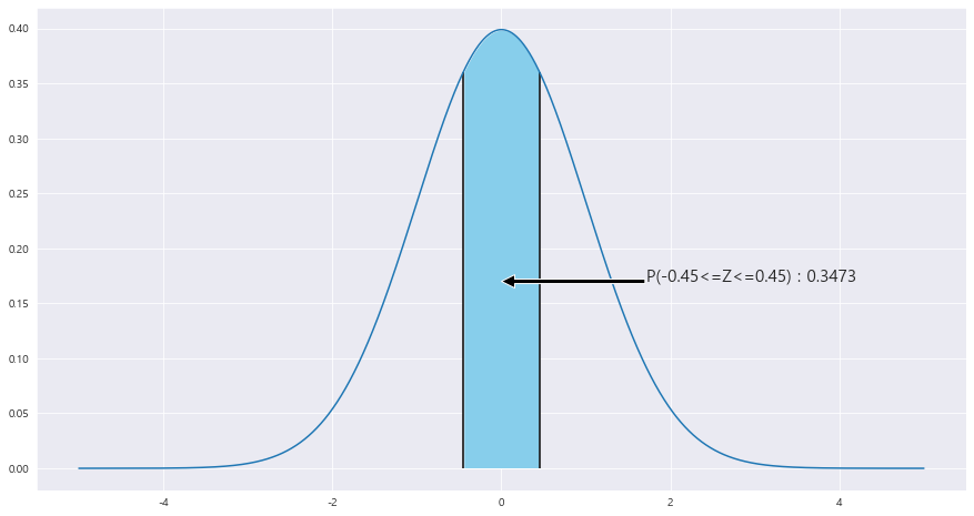 ax.fill_between(x, stats.norm.pdf(x, loc=0 , scale =1) , 0 , where = (x<=z_1) & (x>=z_2) , facecolor = 'skyblue') # x값 , y값 , 0 , x<=0 인곳 , 색깔