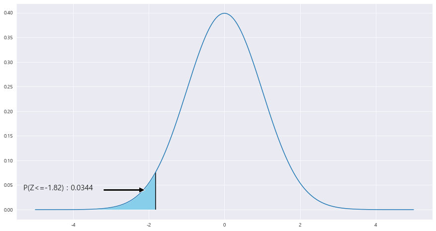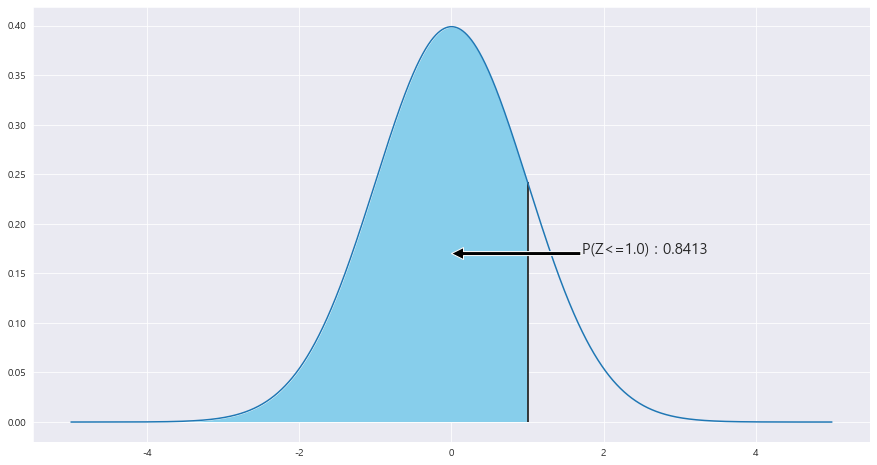 ax.fill_between(x, stats.norm.pdf(x, loc=0 , scale =1) , 0 , where = (x<=z_1) , facecolor = 'skyblue') # x값 , y값 , 0 , x<=0 인곳 , 색깔