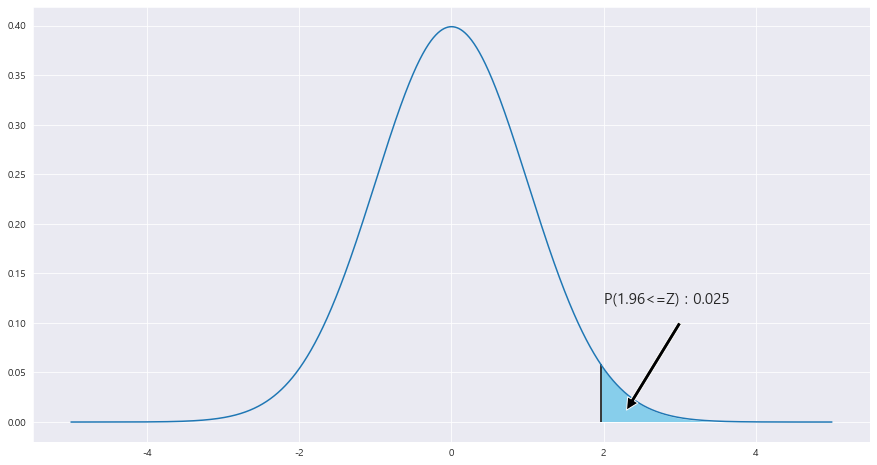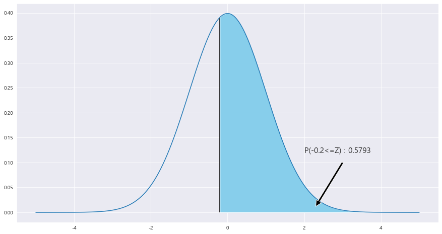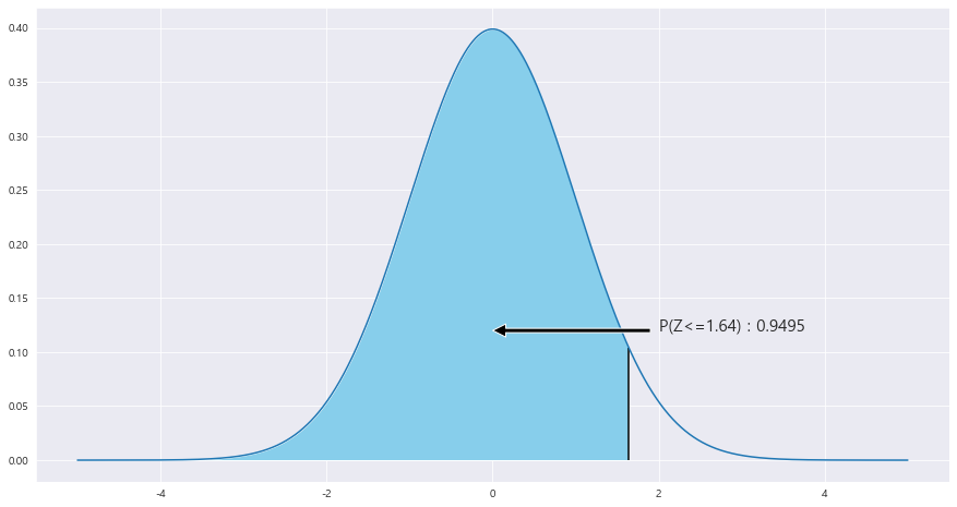 ax.fill_between(x, stats.norm.pdf(x, loc=0 , scale =1) , 0 , where = (x>=z_1) , facecolor = 'skyblue') # x값 , y값 , 0 , x<=0 인곳 , 색깔