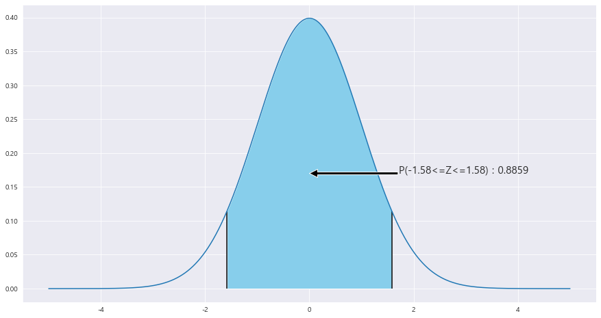 ax.fill_between(x, stats.norm.pdf(x, loc=0 , scale =1) , 0 , where = (x<=z_1) & (x>=-z_1) , facecolor = 'skyblue') # x값 , y값 , 0 , x<=0 인곳 , 색깔
