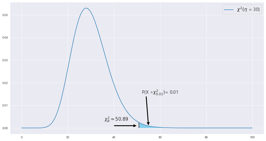 ax.fill_between(x, scipy.stats.chi2(dof).pdf(x) , where = (x>=X_r) , facecolor = 'skyblue') # x값 , y값 , 0 , x조건 인곳 , 색깔