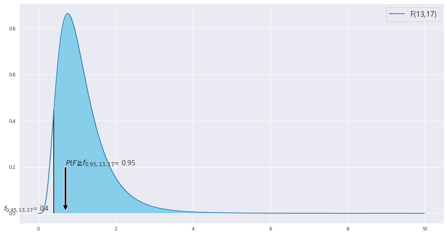 ax.text(X_r + 0.3 , 0.21 , r'$P(F\geqq f_{0.95,13,17}$' + f'= {area}' , fontsize = 14)