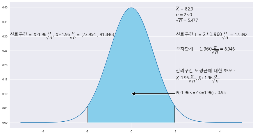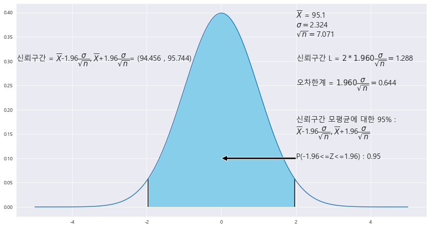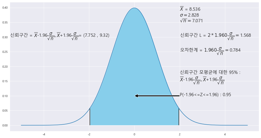 ax.text(2 , .25, r'오차한계 = ${%.3f}\dfrac{\sigma}{\sqrt{n}} = $' % z_1 + f'{round(z_1 * STDS / math.sqrt(n),3)}',fontsize=15)