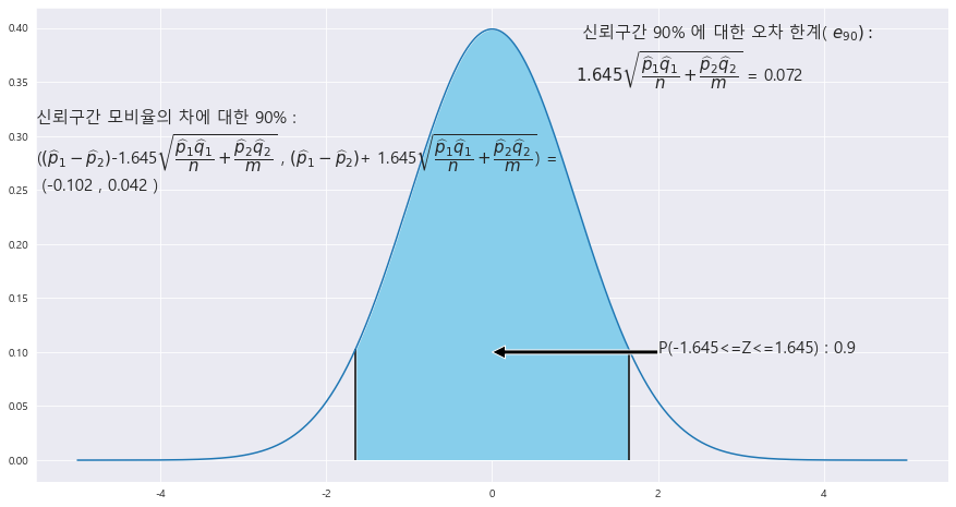 ax.text(-5.5 , .25, f'신뢰구간 모비율의 차에 대한 {trust}% : \n' + r'($\left(\widehat{p}_{1} - \widehat{p}_{2}\right)$' +f'-{z_1}' + r'$\sqrt{\dfrac{\widehat{p}_{1}\widehat{q}_{1}}{n}+\dfrac{\widehat{p}_{2}\widehat{q}_{2}}{m}}$' +' , '+ r'$\left(\widehat{p}_{1} - \widehat{p}_{2}\right)$' +f'+ {z_1}' + r'$\sqrt{\dfrac{\widehat{p}_{1}\widehat{q}_{1}}{n}+\dfrac{\widehat{p}_{2}\widehat{q}_{2}}{m}}$) =' + f'\n ({round(p1-p2 - z_1* math.sqrt(p1*(1-p1)/A + p2*(1-p2)/B),4)} , {round(p1-p2 + z_1* math.sqrt(p1*(1-p1)/A + p2*(1-p2)/B),4)} )',fontsize=15)