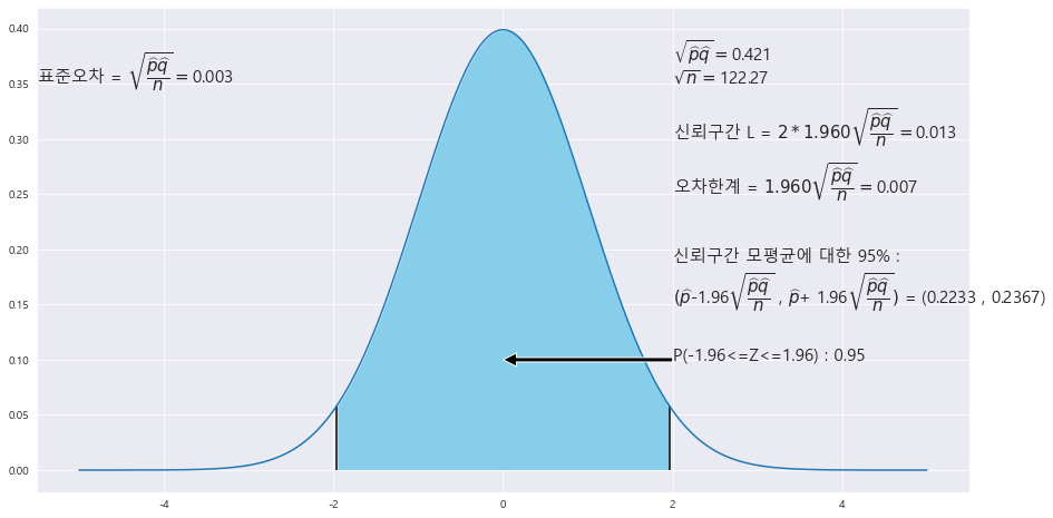 ax.text(2 , .25, r'오차한계 = ${%.3f}\sqrt{\dfrac{\widehat{p}\widehat{q}}{n}} = $' % z_1 + f'{round( z_1 * math.sqrt(RATIO * (1-RATIO) / n),3)}',fontsize=15)