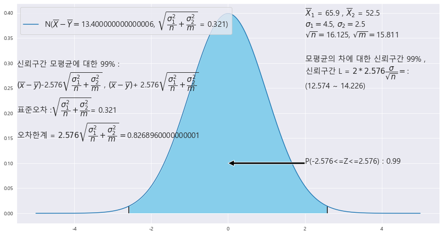ax.text(-5.5 , .15, r'오차한계 = ${%.3f}\sqrt{\dfrac{\sigma_{1}^{2}}{n}+\dfrac{\sigma_{2} ^{2}}{m}} = $' % z_1 + f'{z_1 * round(math.sqrt(Var_A/n_A + Var_B/n_B) , 3)}',fontsize=15)