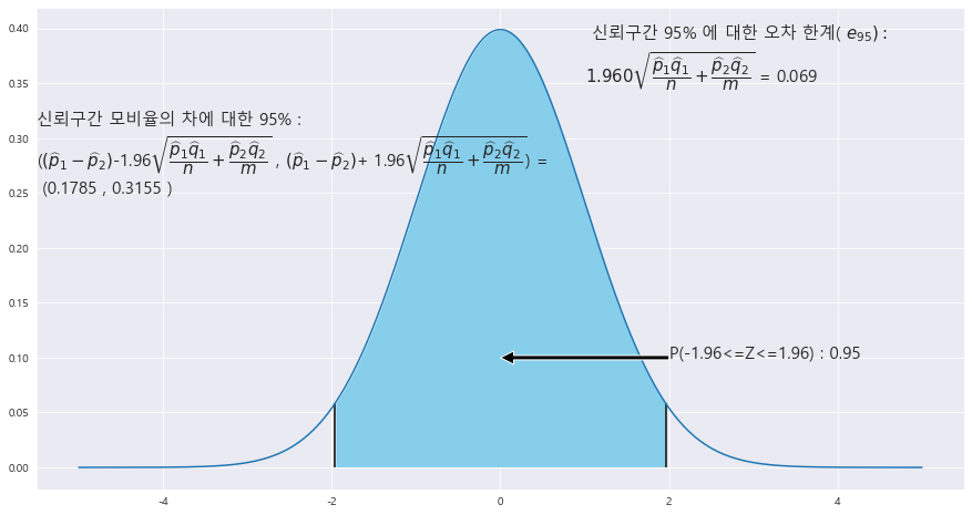 ax.text(-5.5 , .25, f'신뢰구간 모비율의 차에 대한 {trust}% : \n' + r'($\left(\widehat{p}_{1} - \widehat{p}_{2}\right)$' +f'-{z_1}' + r'$\sqrt{\dfrac{\widehat{p}_{1}\widehat{q}_{1}}{n}+\dfrac{\widehat{p}_{2}\widehat{q}_{2}}{m}}$' +' , '+ r'$\left(\widehat{p}_{1} - \widehat{p}_{2}\right)$' +f'+ {z_1}' + r'$\sqrt{\dfrac{\widehat{p}_{1}\widehat{q}_{1}}{n}+\dfrac{\widehat{p}_{2}\widehat{q}_{2}}{m}}$) =' + f'\n ({round(p1-p2 - z_1* math.sqrt(p1*(1-p1)/A + p2*(1-p2)/B),4)} , {round(p1-p2 + z_1* math.sqrt(p1*(1-p1)/A + p2*(1-p2)/B),4)} )',fontsize=15)