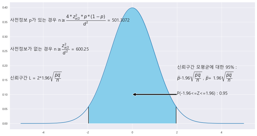 ax.text(-5.5 , .25, f'사전정보가 없는 경우 n' + r'$\geq\dfrac{z^2_{a/2}}{d^2}$' + f' = {round(z_1**2 / d**2,2)}',fontsize=15)