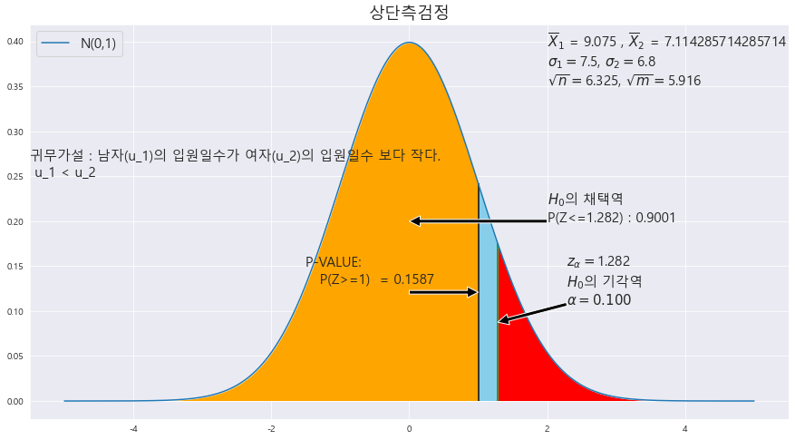 귀무가설(남자의 입원 일수가 여자의 입원 일수보다 더 길지 않다) ==> u_1 < u_2 ==> u_1 - u_2 < 0 상단측 검정