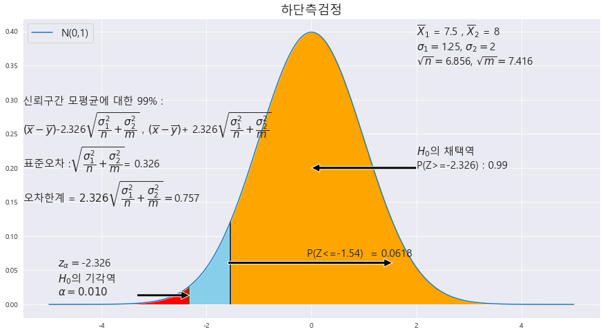 # ax.text(-5.5 , .15, r'오차한계 = ${%.3f}\sqrt{\dfrac{\sigma_{1}^{2}}{n}+\dfrac{\sigma_{2} ^{2}}{m}} = $' % t_1 + f'{round(t_1 * STDS , 3)}',fontsize=15)