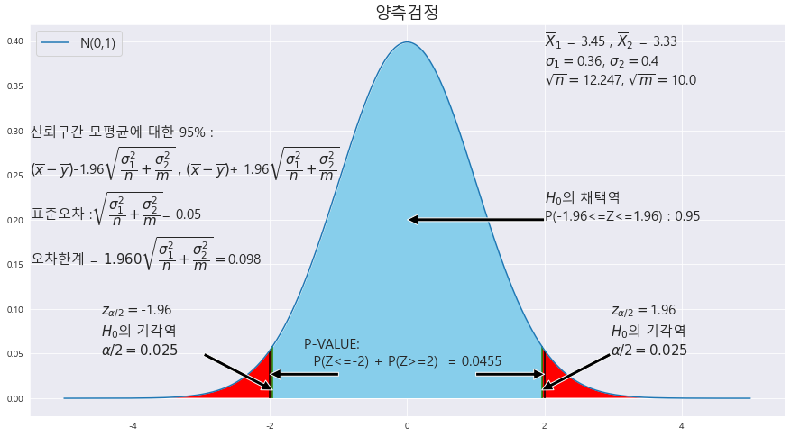 # ax.text(-5.5 , .2 , f'표준오차 :' + r'$\sqrt{\dfrac{\sigma_{1}^{2}}{n}+\dfrac{\sigma_{2} ^{2}}{m}}$' + f'= {round(STDS,3)}' , fontsize = 15)