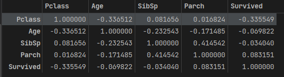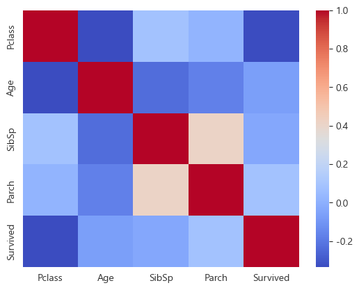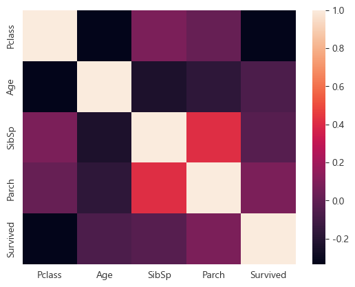 ==>가장 큰 상관관계를 보이는 부분은 Parch(함께 탑승한 부모 및 자녀의 수)와 SibSp(함께 탑승한 형제 및 배우자 수)이다. ==> 0.414542