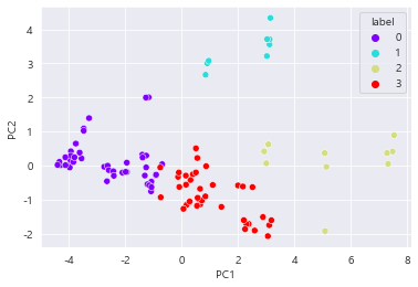 sns.scatterplot(x= 'PC1' , y='PC2' , data = customer_pca , hue = 'label' , palette= 'rainbow') # 산점도 그리기
