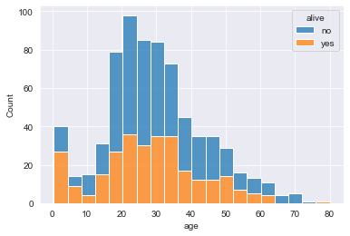sns.histplot(data= titanic , x='age' , hue = 'alive') # 범주별로 구분 데이터